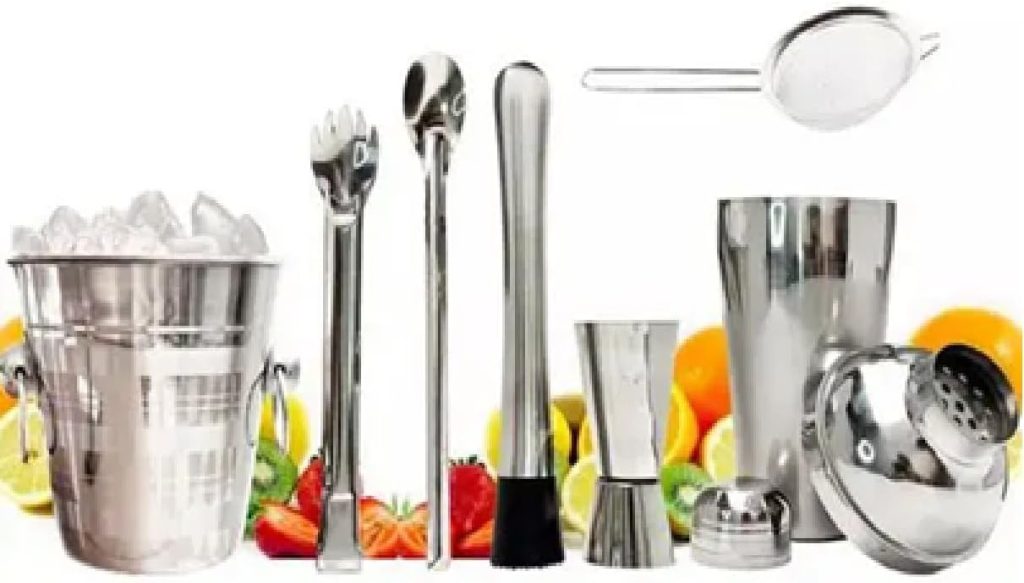 Itens: Coqueteleira 500 ml com coador e tampa Socador 20 cm com ponta plástica Dosador 30/60 ml Balde para gelo 900ml Pegador de gelo 15 cm Colher bailarina 20 cm Peneira 21 cm Limpeza e Conservação: Para lavar, utilize apenas detergente neutro e esponjas macias para não riscar o produto. Se preferir, pode utilizar água quente. Mantenha longe do alcance das crianças e nunca utilize em fornos elétricos, micro-ondas, freezers ou lava louças.