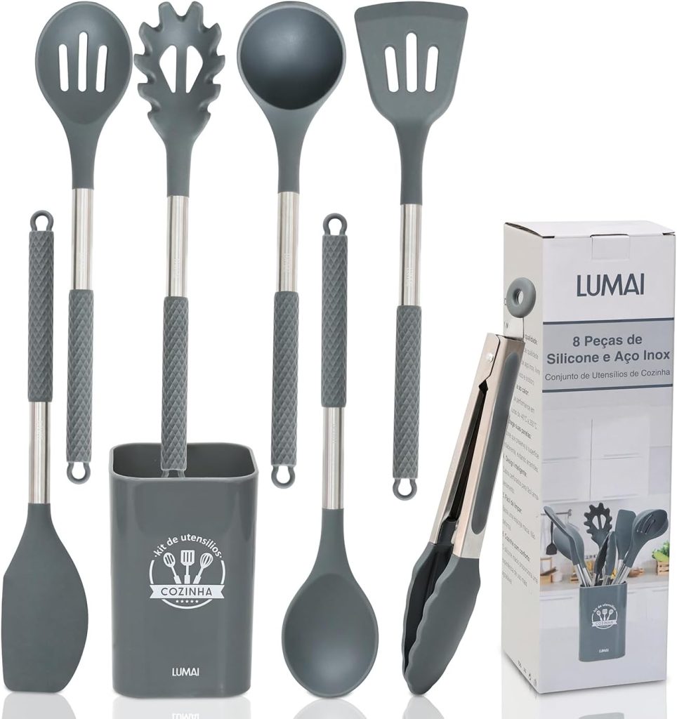 LUMAI Kit 8 Utensílios de Cozinha Grandes em Silicone e Aço Inox, Resistentes ao Calor, Antiderrapantes e Antirriscos, Acessórios de Cozinha Inclui Espátula, Colher, Pegador de Massa, Concha – Cinza