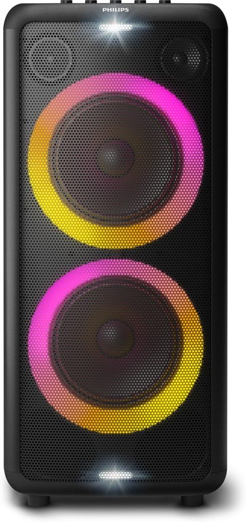 Party Speaker Philips bluetooth com 2 falantes, luzes de led, bluetooth, usb, auxiliar, entradas para microfone e guitarra e energia para 14h TAX5208/78