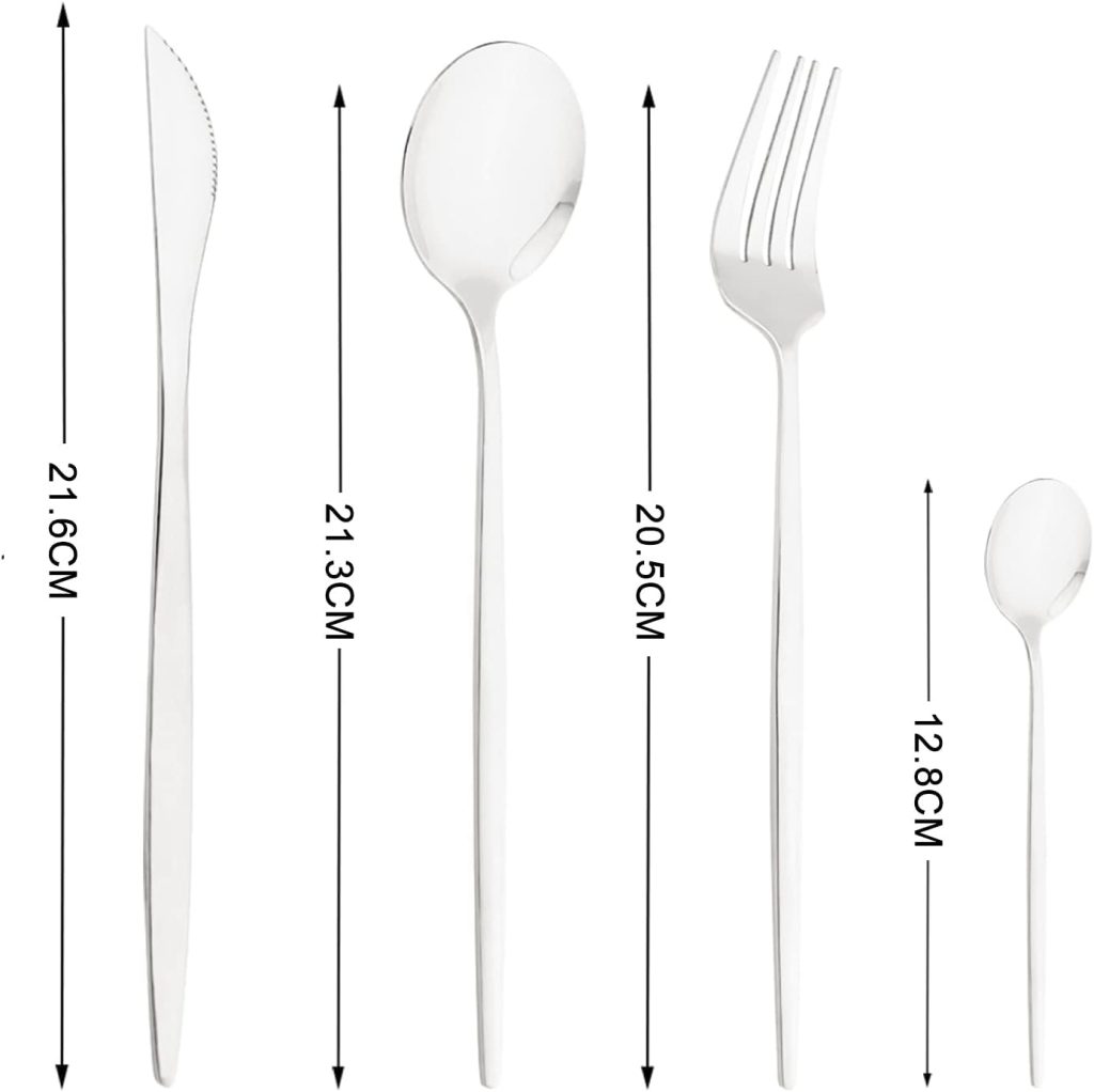 【Uso e Manutenção】: É recomendado lavar o conjunto de talheres na máquina de lavar louça e à mão, secar ao ar e armazenar. Mesmo após muitos usos e lavagens, este conjunto moderno de talheres não perderá o seu brilho espelhado. O uso de escovas de arame, esponjas duras ou outros materiais duros não é recomendado, pois podem danificar os talheres.