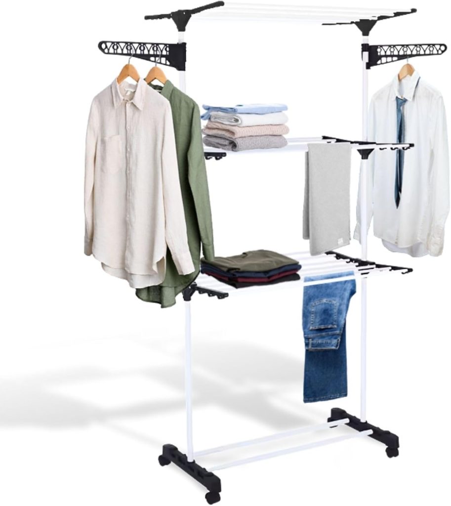 Varal De Chão 3 Andares Grande de Roupas Dobrável Regulável Retrátil com Rodinhas e Ganchos Compacto